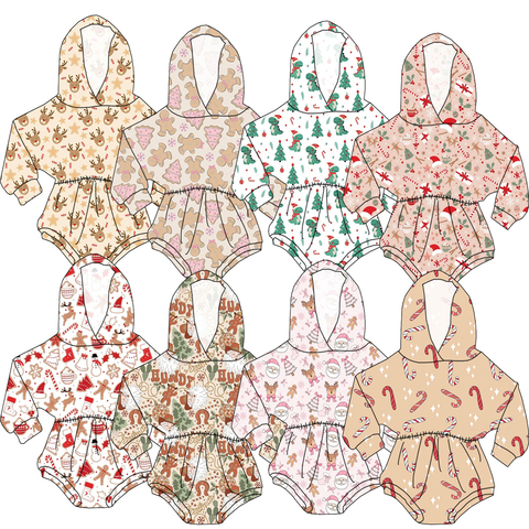 Оптовая продажа, цельный комбинезон с рождественским узором и длинными рукавами с капюшоном и плиссированной талией, симпатичная стильная одежда для девочек